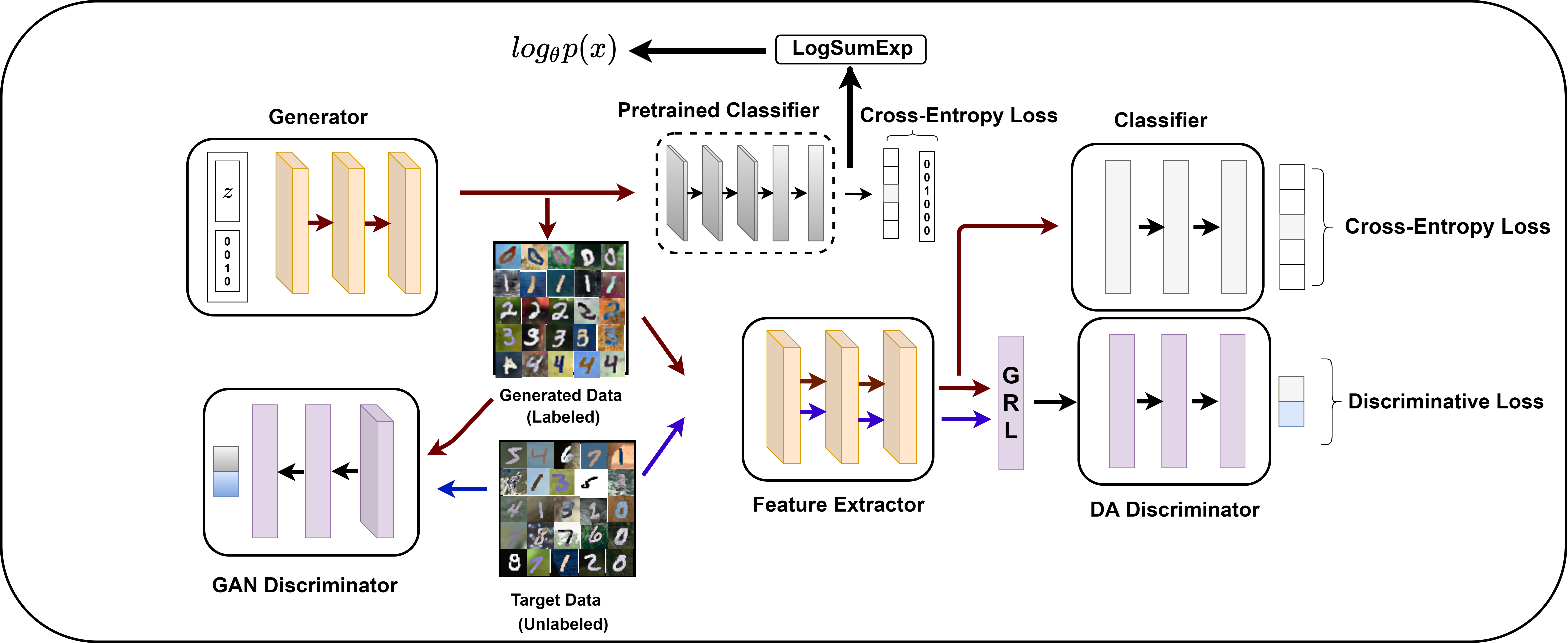 Unsupervised Domain adaptation methods solve the adaptation problem for an unlabeled target set, assuming that the source dataset is available with all labels. However, the availability of actual source samples is not always possible in practical cases. It could be due to memory constraints, privacy concerns, and challenges in sharing data. This practical scenario creates a bottleneck in the domain adaptation problem. This paper addresses this challenging scenario by proposing a domain adaptation technique that does not need any source data. Instead of the source data, we are only provided with a classifier that is trained on the source data. Our proposed approach is based on a generative framework, where the trained classifier is used for generating samples from the source classes. We learn the joint distribution of data by using the energy-based modeling of the trained classifier. At the same time, a new classifier is also adapted for the target domain. We perform various ablation analysis under different experimental setups and demonstrate that the proposed approach achieves better results than the baseline models in this extremely novel scenario.