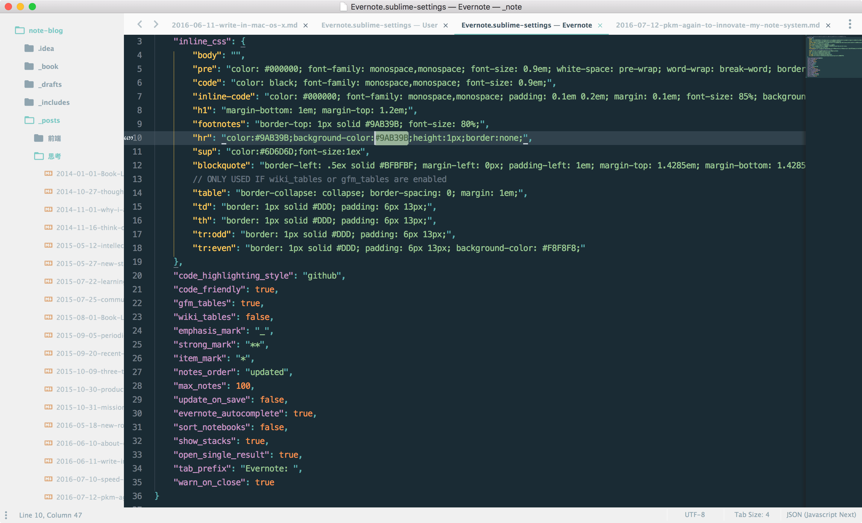而最完美的书写编辑体验,当然需要借助代码编辑器的强大以及 Markdown 语法的简洁。使用 Sublime Text 的 Evernote 插件打开印象笔记内容,顺便就可以完美得格式化,然后在编辑器里删除掉我们不需要的而留下所需要的,而且这个 Sublime-Evernote 插件还可以自定义样式,代码高亮和字体格式什么的都配置成与博客相同,在获得一致性阅读体验的同时保持了私密性。