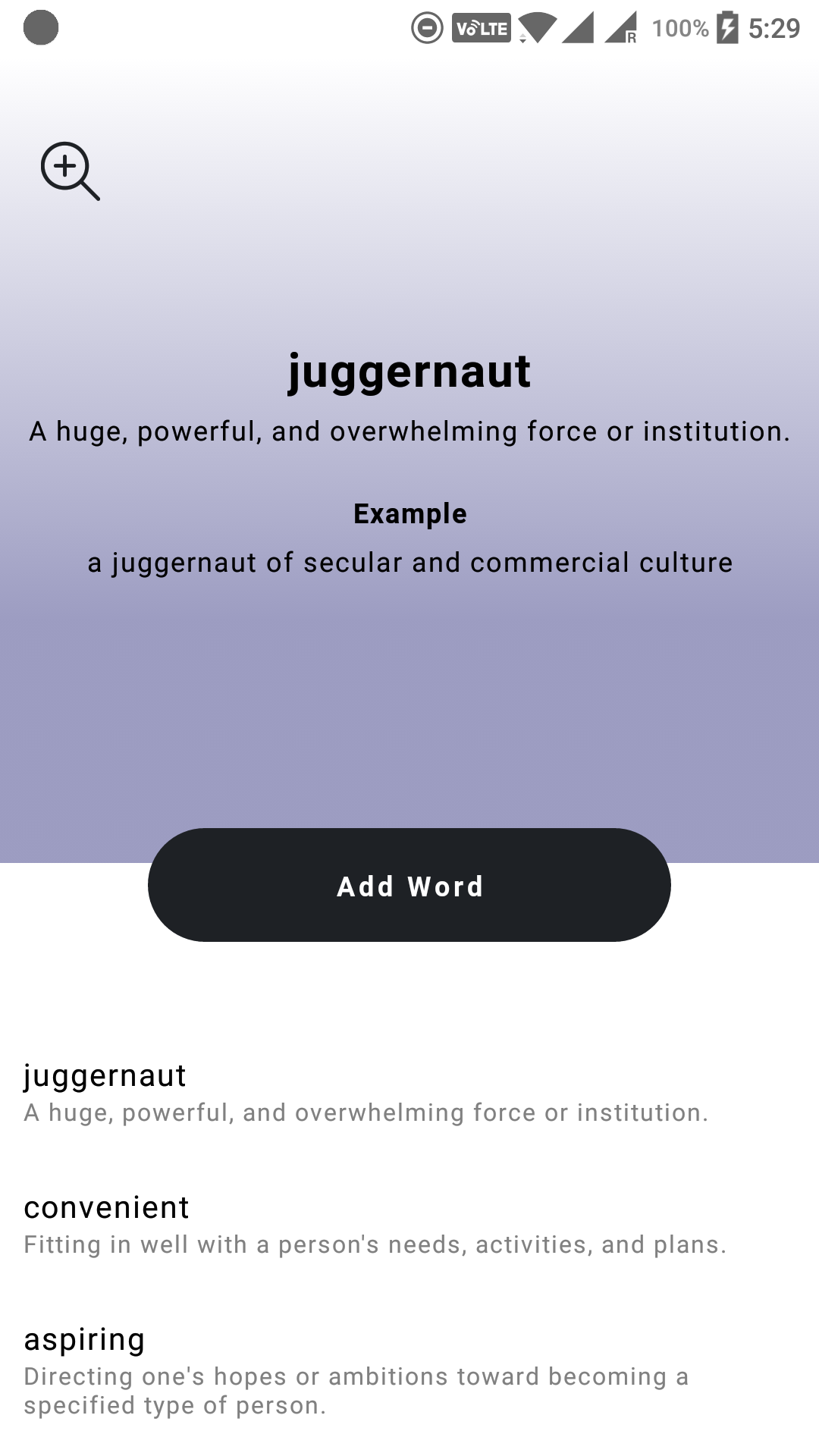 Save newly learned words quickly and easily with their meaning and definition.