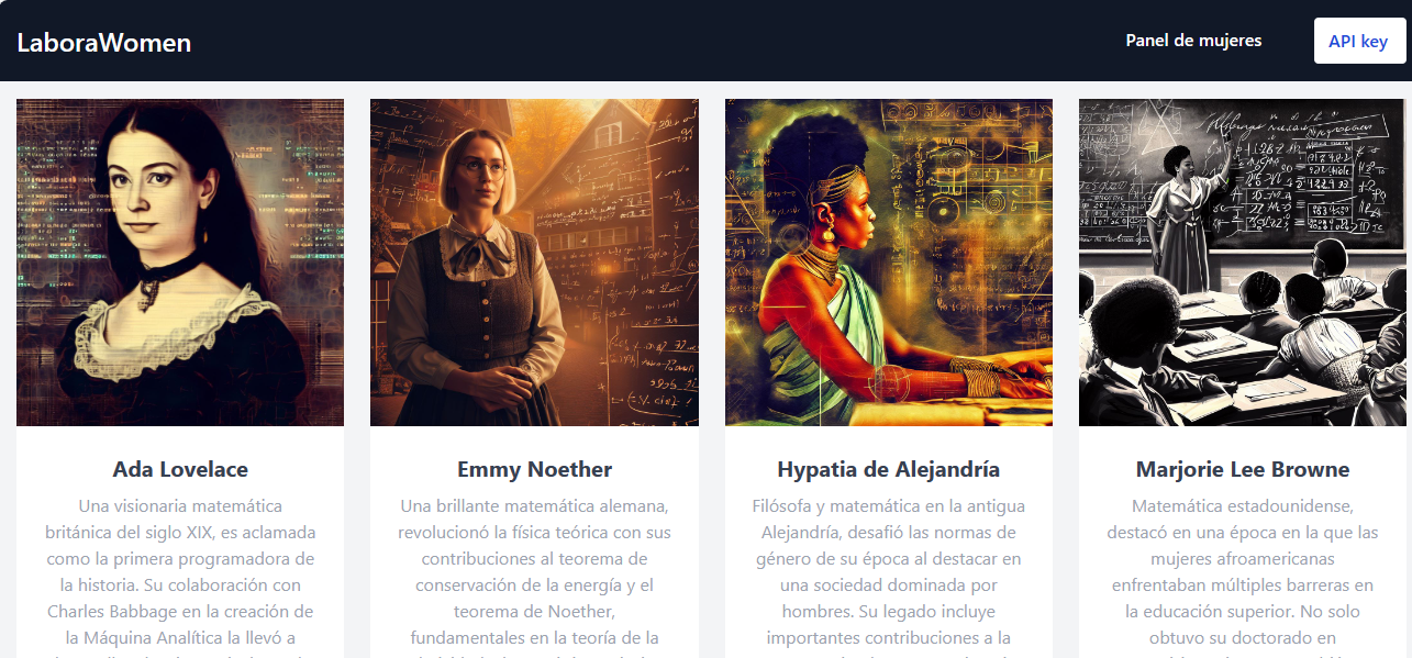 - Usando la API de Open AI, la aplicación debe permitir al usuario interactuar con un personaje/entidad a través de un chat. Por ejemplo, si usamos la data de ejemplo de Dataverse, correspondiente a las mujeres con mayores contribuciones a la programación en la historia, una usuaria puede establecer una conversación interactiva con Ada Lovelace a través del sistema de chat, obteniendo información sobre sus logros, desafíos y contribuciones a la informática. La inteligencia artificial de OpenAI permite que las respuestas sean informativas y personalizadas según las preguntas de los usuarios.