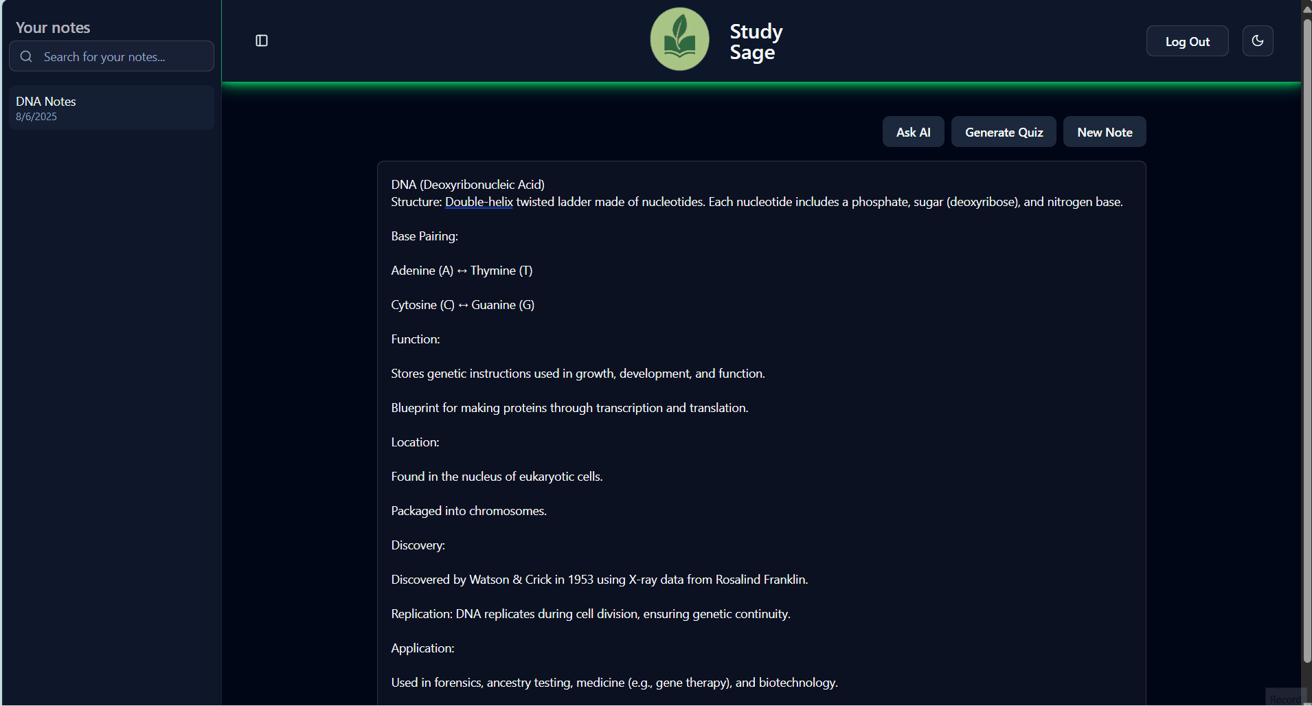StudySage is an AI-powered note-taking web application built to help students study more effectively. It leverages a PostgreSQL database via Supabase to store user notes and authentication data, uses a Prisma ORM for seamless database interaction, and integrates the OpenAI API to provide intelligent features like note summarization, AI-powered Q&A, and quiz generation. The frontend is built with Next.js 15 using the App Router, and styled with shadcn/ui for a clean, responsive user experience.