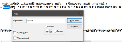 Diberikan sebuah gambar, dengan melakukan penelusuran gambar pada text editor dengan menuliskan format flag yaitu forestyCTF maka didapatkan kumpulan bilangan decimal