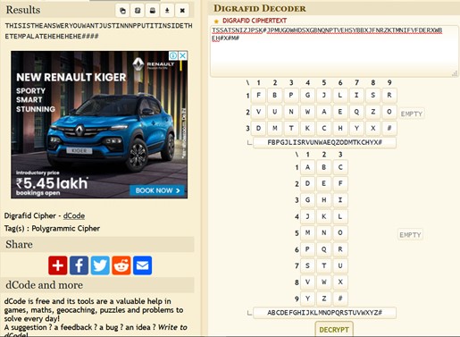 Diberikan ketiga buah kode yang terenkripsi setelah ditelusuri ,etode yang digunakan pada soal ini yaitu digrafid cipher dengan memasukkan kedua key yang telah ada pada deskripsi soal dan kode pertama maka didapatkan flagnya.