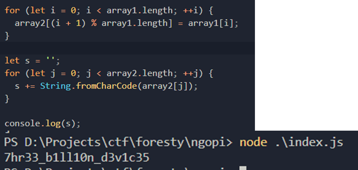 Diberikan kelas java, lakukan decompile .class kemudian modifikasi code (karena saya tidak suka menggunakan java, maka saya menggunakan nodejs) kemudian jalankan program tersebut sehingga didapatkan flagnya.