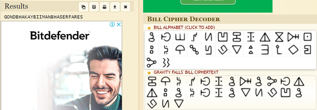 Diberikan sebuah gambar, setelah ditelusuri gambar tersebut merupakan gambar simbol pada referensi animasi gravity falls yang menggunakan Bill cipher, lakukan decode sehingga didapatkan result GONDBHAKAYBIIMANBHASERFARES.