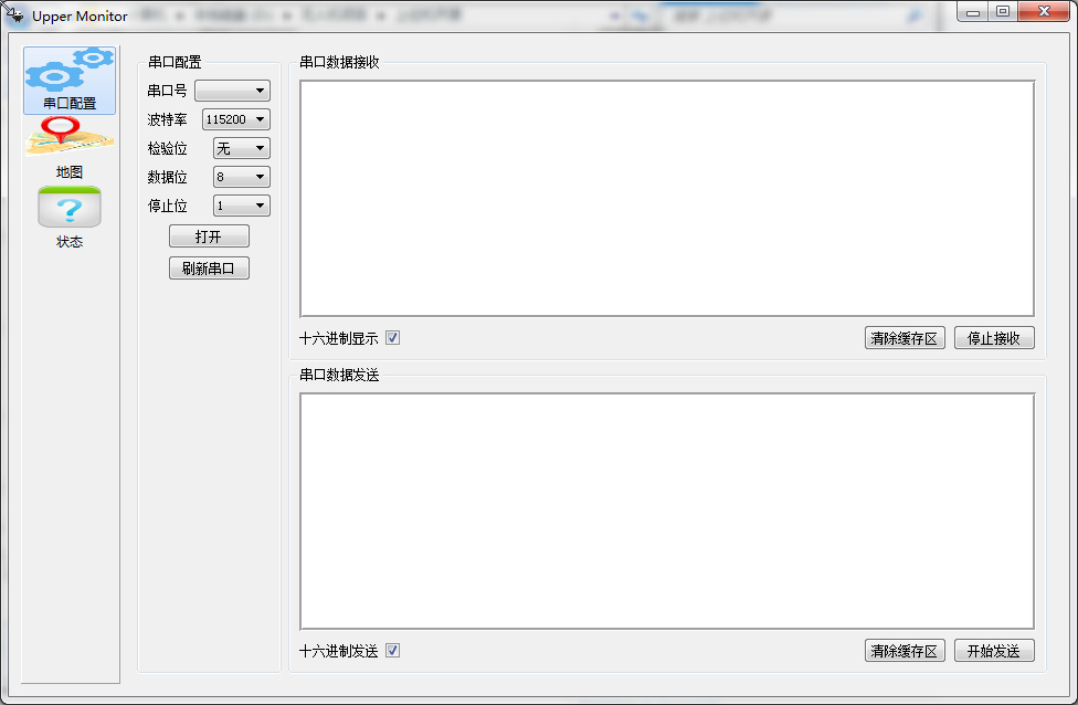 地面站上位机实现人机交互功能主要依赖于三个子界面:串口配置页、地图页和状态页。