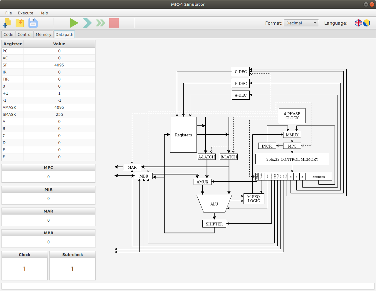 MIC-1 Simulator is an interactive simulator for the MIC-1 CPU. The application is primarily intended to be used by the students of the Faculty of Electrical Engineering in Sarajevo, but everyone is welcome to use it. The idea is that the user, while using the application, gains a better understanding of the principles behind the MIC-1 CPU. The user is able to write code using the supported instruction set, to run the code and to see it being executed through the CPU cycles and/or sub-cycles. While the instructions are being executed the user can keep track of the memory state, control memory state, CPU registers and the different CPU components.