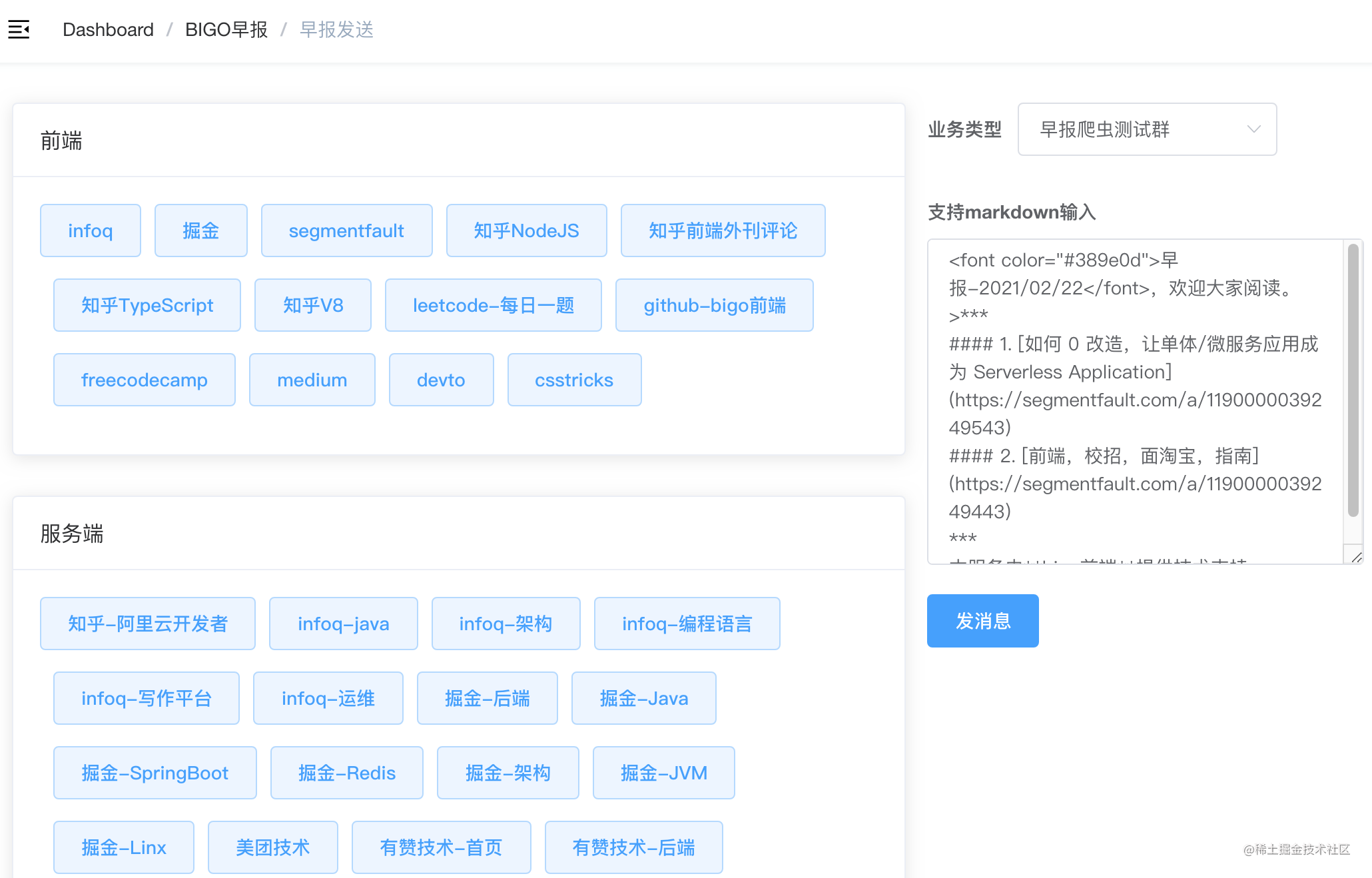 ## 前端早报 ## 系统介绍 bigo前端早报系统,包括但不限于掘金、知乎、infoq等咨询站点内容推送 支持推送到:企业微信 待支持:钉钉 开发 $ npm i $ npm run dev $ open http://localhost:9001/ 功能预览 实现原理 使用puppeteer获取html结构,然后使用cheerio解析dom结构,返回爬虫数据。