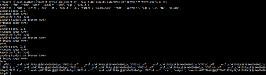(xxx.csv data file for the data folder,such as:TP53-10个口腔拭子交付报告-20170710.csv) Executing this command, you can in the results folder to generate xxx.csv specified in the patients with all reports, report is stored in a separate folder, the folder name and read xxx.csv data source name.