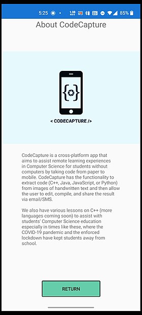 CodeCapture is a cross-platform app that aims to assist remote learning experiences in Computer Science for students without computers by taking code from paper to mobile. CodeCapture has the functionality to extract code (C++, Java, JavaScript, or Python) from images of handwritten text and then allow the user to edit, compile, and share the result via email/SMS. We also have various lessons on C++ (more languages coming soon) to assist with students' Computer Science education especially in times like these, where the COVID-19 pandemic and enforced lockdown have kept students away from school.