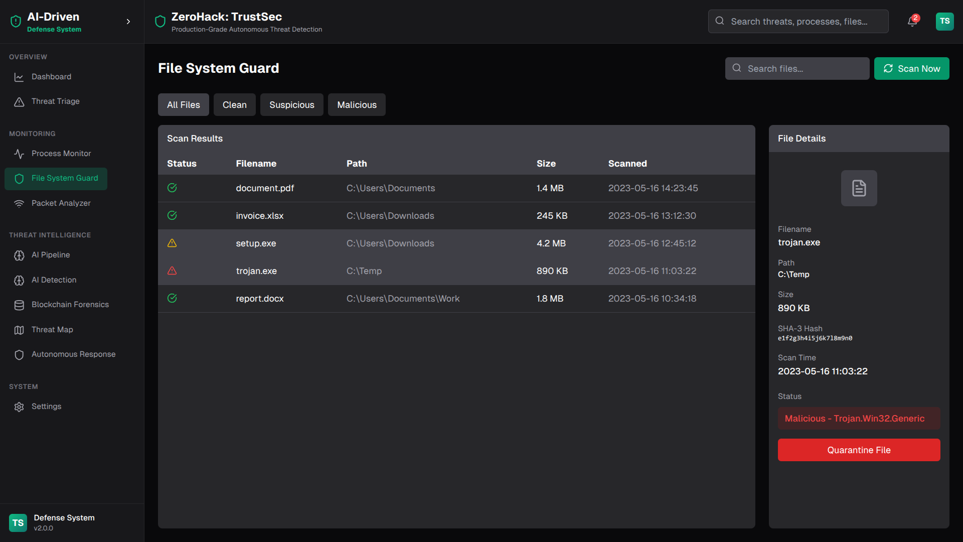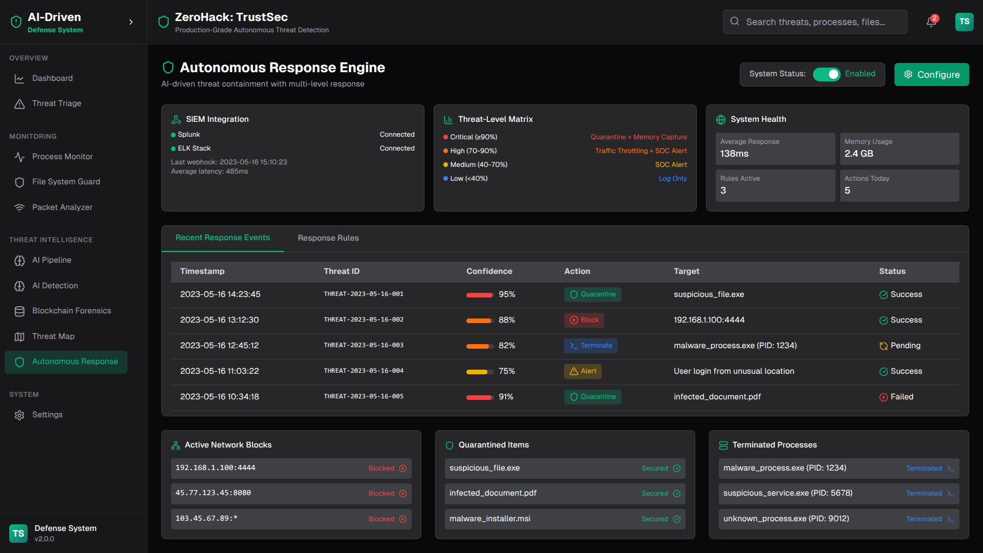 ZeroHack is an enterprise-grade, fully-integrated cybersecurity platform that combines advanced AI/ML threat detection, blockchain-based forensics, and real-time response automation to provide comprehensive protection against modern cyber threats. Built with production-ready architecture featuring FastAPI backend, Next.js frontend, and smart contract automation.