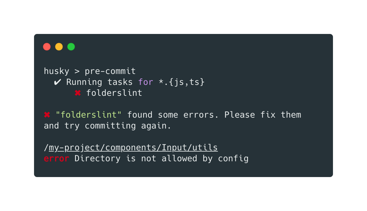 For example, this is how package.json can look like if you want to run folderslint as a pre-commit hook via husky tool: