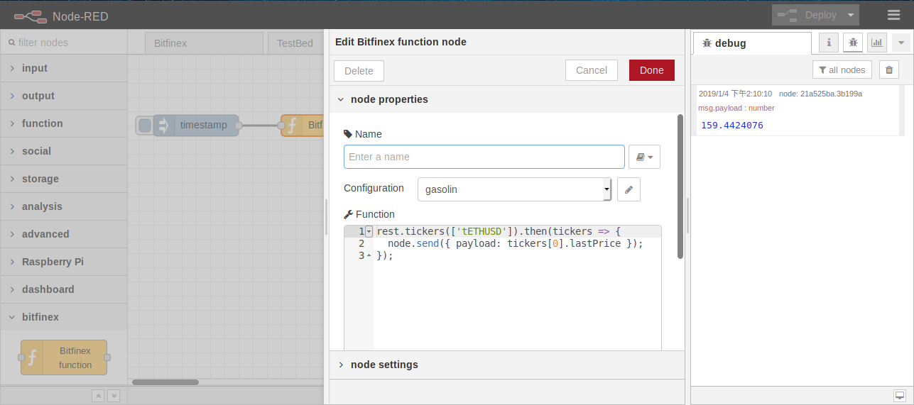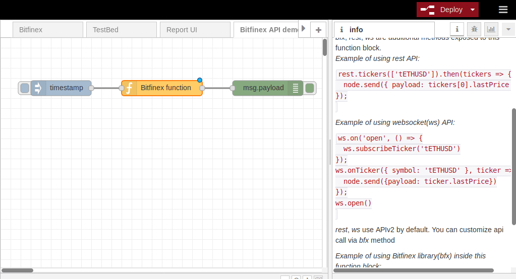 - A Function block where you can write your own code to execute Bitfinex's nodejs API library