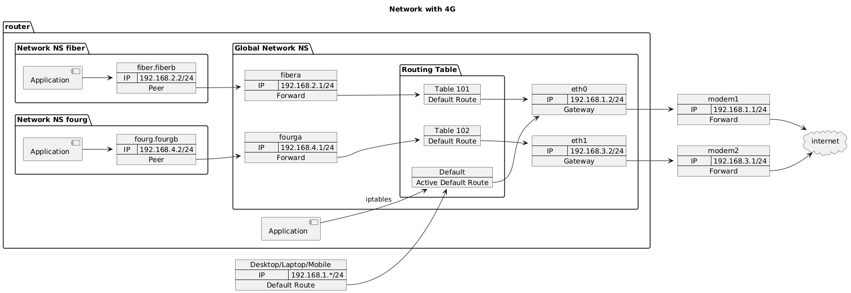 # ip -4 route list # ip route list default via 192.168.1.2 dev eth0 src 192.168.1.66 metric 202 default via 192.168.3.1 dev wlan0 proto dhcp src 192.168.3.100 metric 303 192.168.1.0/24 dev eth0 proto dhcp scope link src 192.168.1.66 metric 202 192.168.2.0/24 dev fibera proto kernel scope link src 192.168.2.1 192.168.3.0/24 dev wlan0 proto dhcp scope link src 192.168.3.100 metric 303 192.168.4.0/24 dev fourga proto kernel scope link src 192.168.4.1 # ip netns exec fiber ip -4 route list default via 192.168.2.1 dev fiberb 192.168.2.0/24 dev fiberb proto kernel scope link src 192.168.2.2 # ip netns exec fourg ip -4 route list default via 192.168.4.1 dev fourgb 192.168.4.0/24 dev fourgb proto kernel scope link src 192.168.4.2