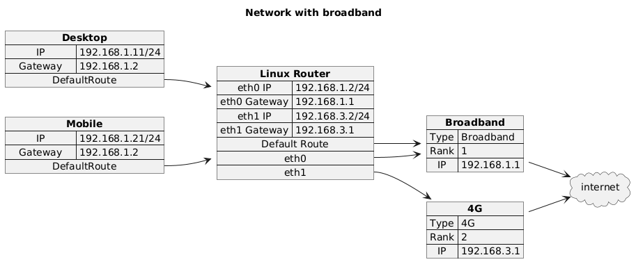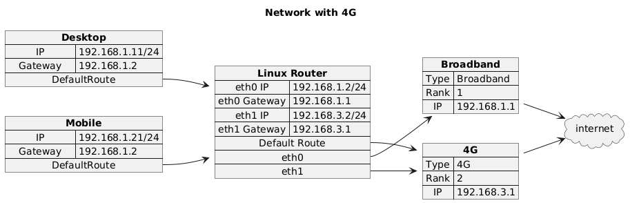 Consider the case where there are two internet connections - broadband and 4G. The requirement is to have broadband as primary connection and 4G as failover internet connection. The broadband is on network 192.168.1.0/24