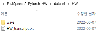 그림과 같이 wav 디렉토리와 json 또는 transcript 파일을 dataset/데이터명 디렉토리에 저장합니다.