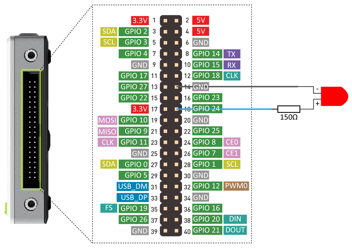 Note: A resistor is needed between the GPIO pin and the LED or otherwise the LED will burn out.