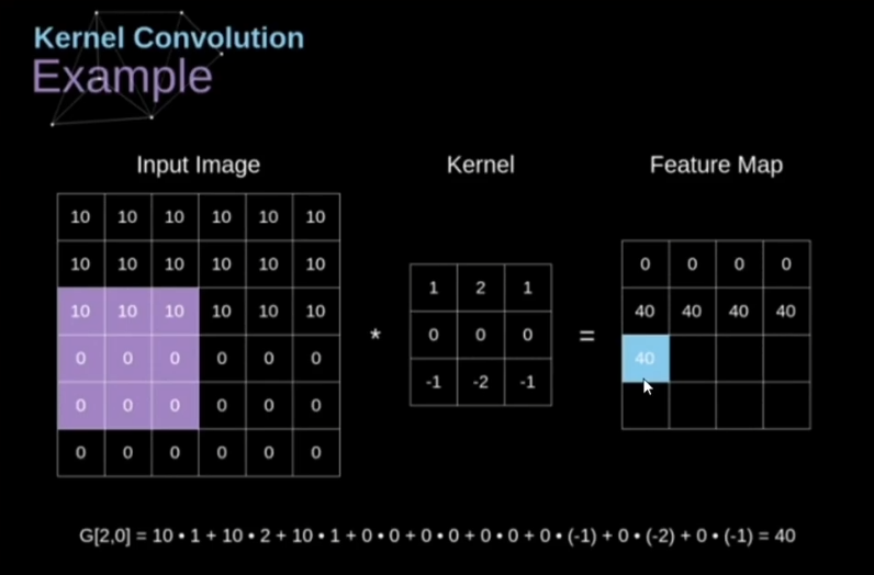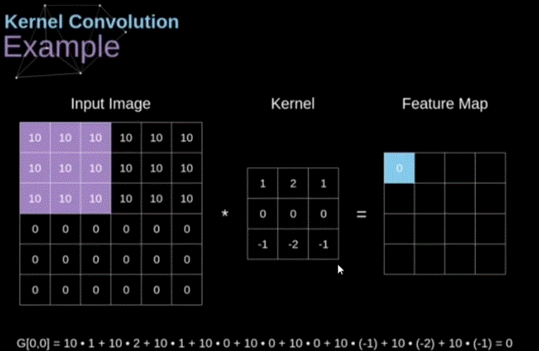 (请注意Kernel卷积核在运算时实际已经水平旋转180度,比如第一行第二列的“2”两侧的1实际已经颠倒位置,但因为值一样所以没有表现出来,PS:如果仅从获得运算结果的角度下,可以暂时理解为一种步骤)
