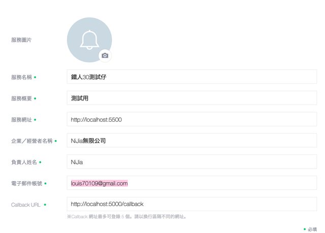 設定的 Callback Url 為 http://YOUR_DOMAIN/callback