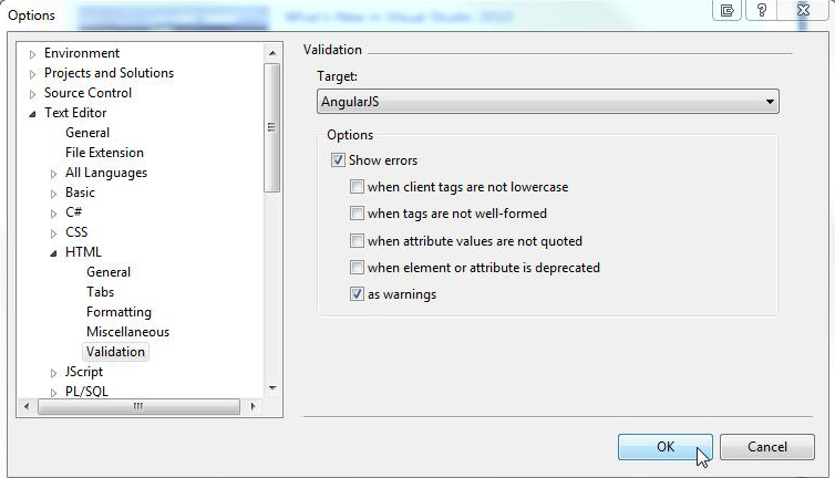 - Copy "html_5_angularjs.xsd" from VS 2012 directory