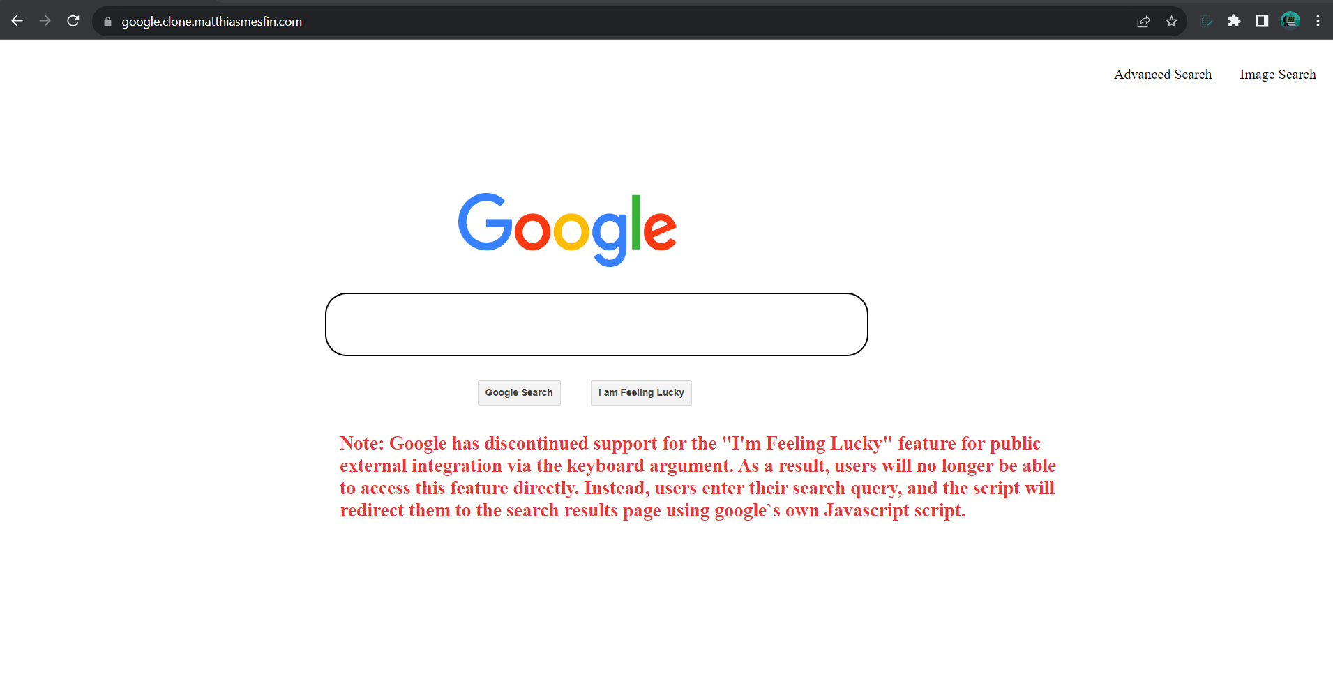 The Google Clone project is deployed and accessible at the following link: Google Clone Demo https://www.google.clone.matthiasmesfin.com