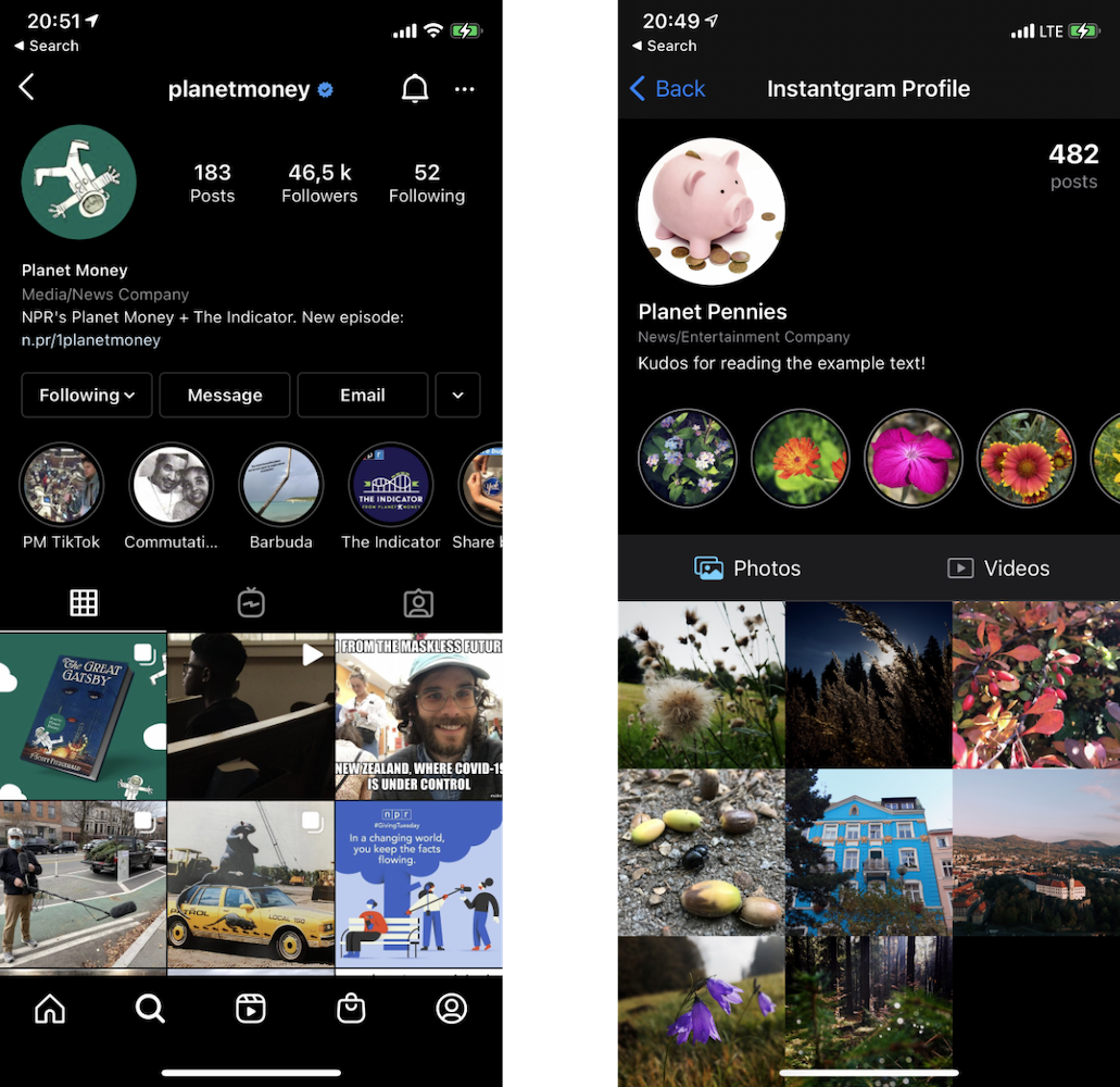 - Instagram profile screen - this practical example shows how to build screen similar to Instagram profile with Compositional Layout and Diffable. You can read more on my blog