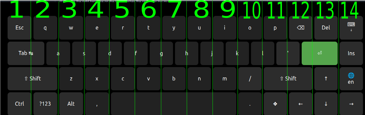 First of all, thanks again for your contribution, some great ideas here! Layouts with different number of keysI haven't checked all 60 layouts, but here are a few different ones off the top of my head: To be honest, I haven't really thought about it before, but I now understand that these differences in layout shapes were the reason why the arrow keys were all placed on the same row. And it's probably best to keep it that way. SUPER keyThe problem with keeping "Super" key only in the uppercase level is that while you see that layer, the "Shift" key is latched. So if you send a "Super + <some_key>" combination, you'd be effectively sending a "Shift + Super + <some_key>" combination, and won't be able to input something like "Super + E" at all. It's probably best to just keep "Super" in both upper and lowercase layers. It should fit in nicely between "?123" and "Alt" keys, for example. This way, the "Ctrl" and "?123" keys would still be where most people would expect to see them. Insert keySimilar to Super key, it would probably be best to just keep it in both upper and lowercase layers. I'd be fine with sacrificing the "Delete" key for that, since there's already a "Backspace" button that does practically the same thing. CSS stylingLooking back at the issues I ran into with customizing CSS styles (button shapes, background and font colors, font size, etc.), I'm now thinking touching those was a mistake. See issues #12, #14, #17, for example. Each deviation from the default styles is an additional chance for something to break in one of the many distros that run Gnome Shell. Changing ABC to ?123Not sure if I'm fully on board with this. It would be rather confusing once you switch to the symbols (last) layer. There's a button with numbers on it, so it looks like it should take you to the numbers layer, but instead you end up on the lowercase layer. Someone will eventually think it's a bug and report it. |