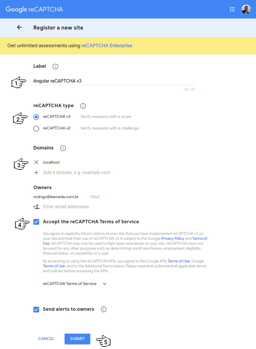 4. Fill in the field Label, click on the option reCAPTCHA 3, Fill in the field Domains, click on the checkbox Accept the reCAPTCHA Terms of Service and click on the button Submit.