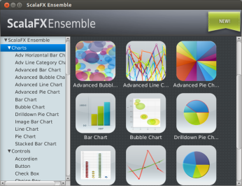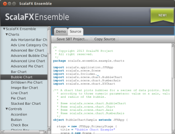 ScalaFX Ensemble can be used by ScalaFX beginners as a set of examples and by more experienced users as a visual reference. Larger size screenshots and information about changes can be found on the ScalaFX Ensemble Home Page.