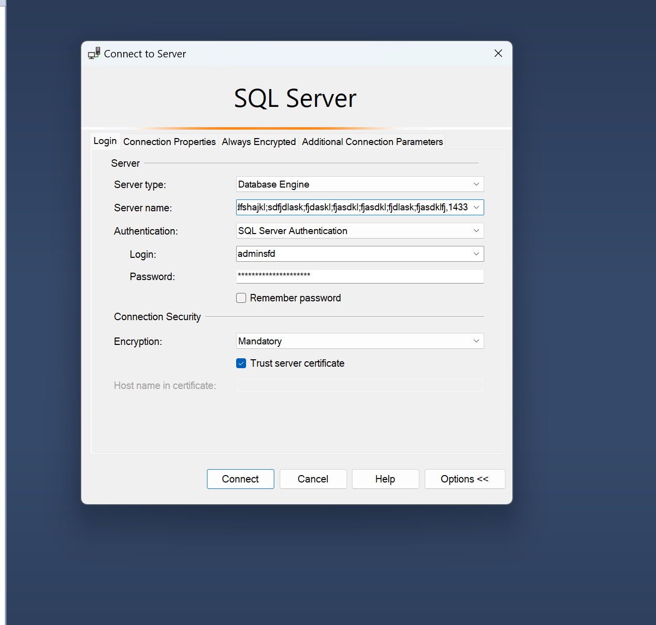 . For authentication, you will select SQL Server Authentication. For the Login section you will input your Master password that you have created, as well as your Master password within the Password section. Make sure Trust server certificate is checkmarked; otherwise, you will not be able to access the database. Select Connect and wait for the database to connect. Once connected successfully, you will be able to see all the folders within the database.