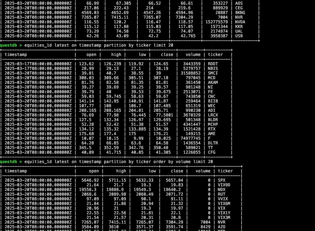 QuestDB comes with a very nice web console, but there's no CLI, so I wrote one (can't live without the terminal!).