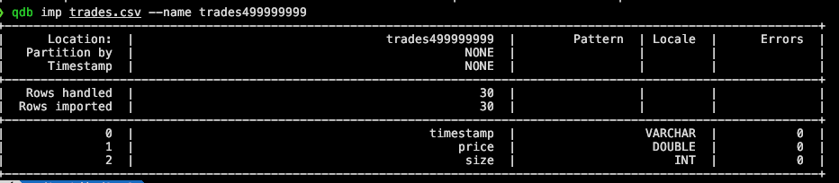 $ qdb-cli imp --name trips trips.csv --partitionBy WEEK --timestamp pickup_datetime