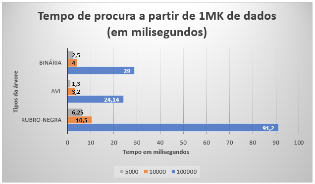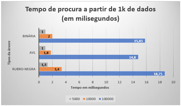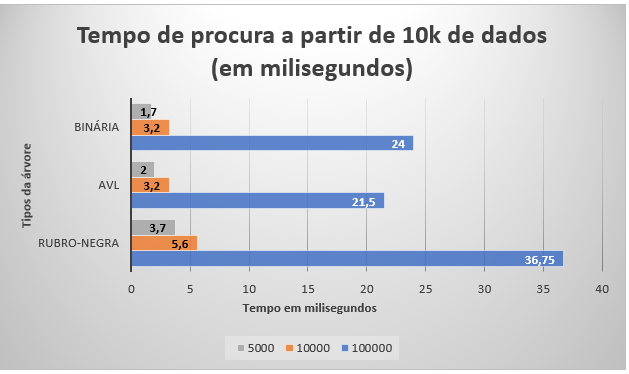 Foi realizada o cálculo da média do tempo de inserção e de pesquisa a partir dos resultados realizados 10 vezes, tendo assim a fórmula M = (soma de N entradas) / N. O resultado foi representado na forma de gráficos separados a a partir da quantidade de dados que o programa usou. Desse modo, esta dividido em 3 gráficos, um usando a base de 1000, 100000 e 1000000 números do tipo float. A barra de coloração cinza representa a procura de 5000 dados, a de cor laranja representa 10000 e a de cor azul representa 100000 dados (dados esses números do tipo float. Nesse mesmo critério, foi feito um gráfico para representar o tempo de inserção desse dados