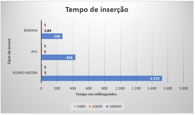 Sobre o tempo de inserção, a medida quevai aumentando a quantidade de números inseridos na AVL, aumentamos também seu tempo em comparação a Binária, no que isso se deve também ao fator de equilíbrio da AVL, que a medida que aumentamos a árvore, teremos que realizar mais rotações para manter sua altura equilibrada
